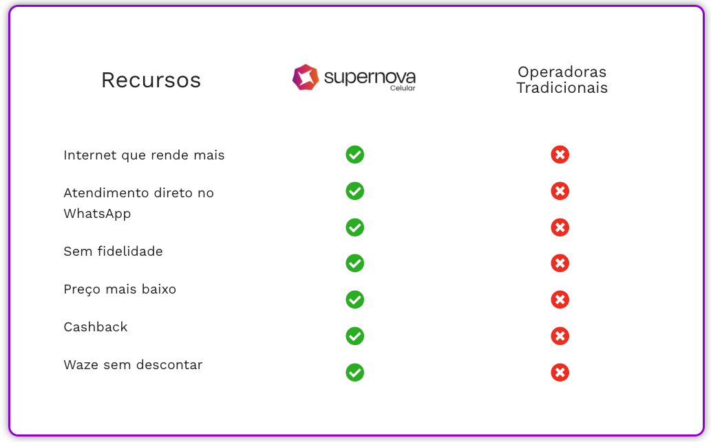Acreditamos que um cliente deve ficar porque gosta do serviço, não por obrigação contratual. Essa liberdade é um dos grandes diferenciais da Supernova em relação às operadoras tradicionais.